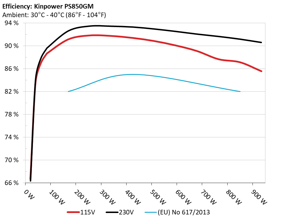 The PSU`s efficiency under high ambient temperatures with 115V and 230V input. For this graph the results of the 10-110% load regulation table are used