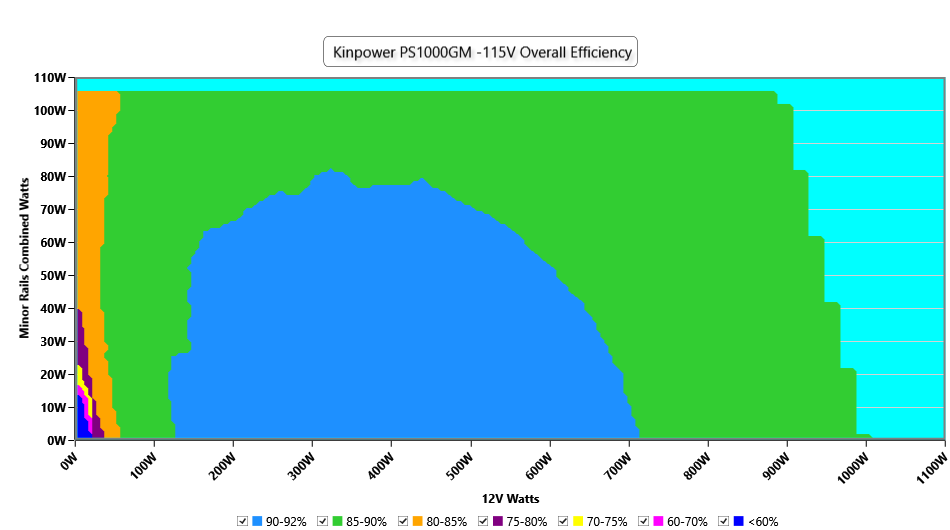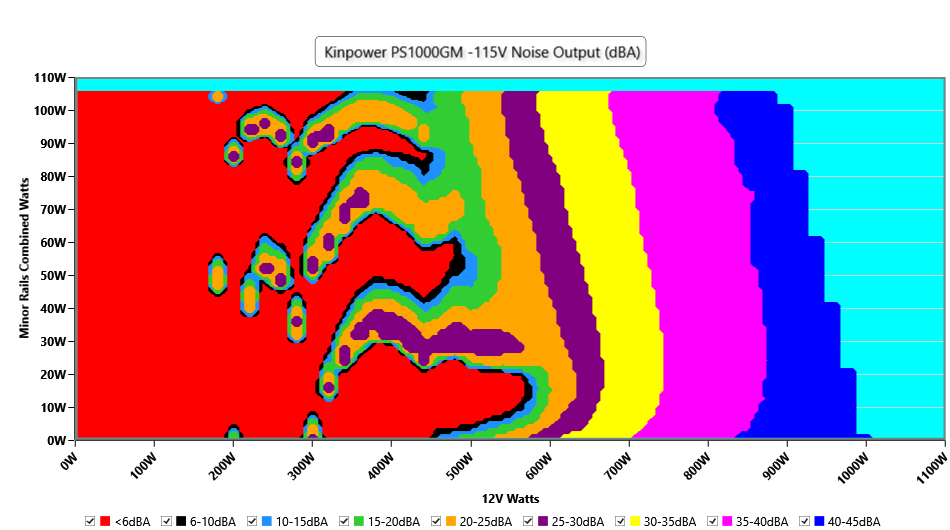 This graph depicts the PSU`s efficiency throughout its entire operational range. For the generation of the efficiency and noise graphs we set our loaders to auto mode through our custom-made software before trying thousands of possible load combinations