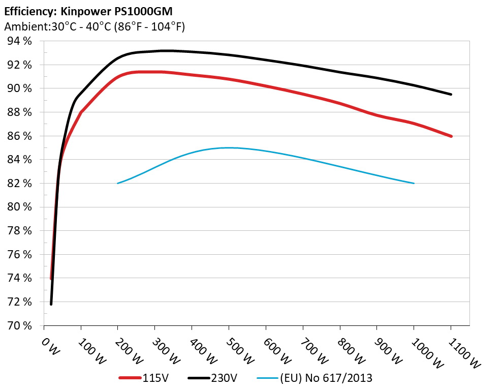 The PSU`s efficiency under high ambient temperatures with 115V and 230V input. For this graph the results of the 10-110% load regulation table are used