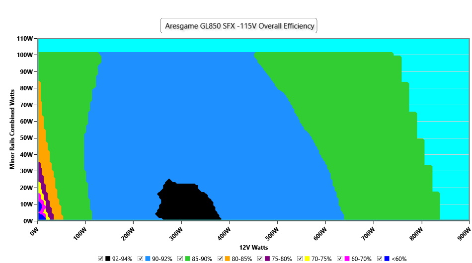 This graph depicts the PSU`s efficiency throughout its entire operational range. For the generation of the efficiency and noise graphs we set our loaders to auto mode through our custom-made software before trying thousands of possible load combinations