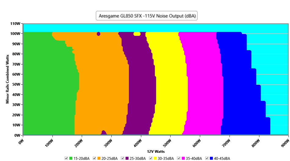 The PSU`s noise in its entire operational range and under 30-32 °C ambient is depicted in this graph. The X axis represents the load on the +12V rail(s) while the Y axis is the load on the minor rails