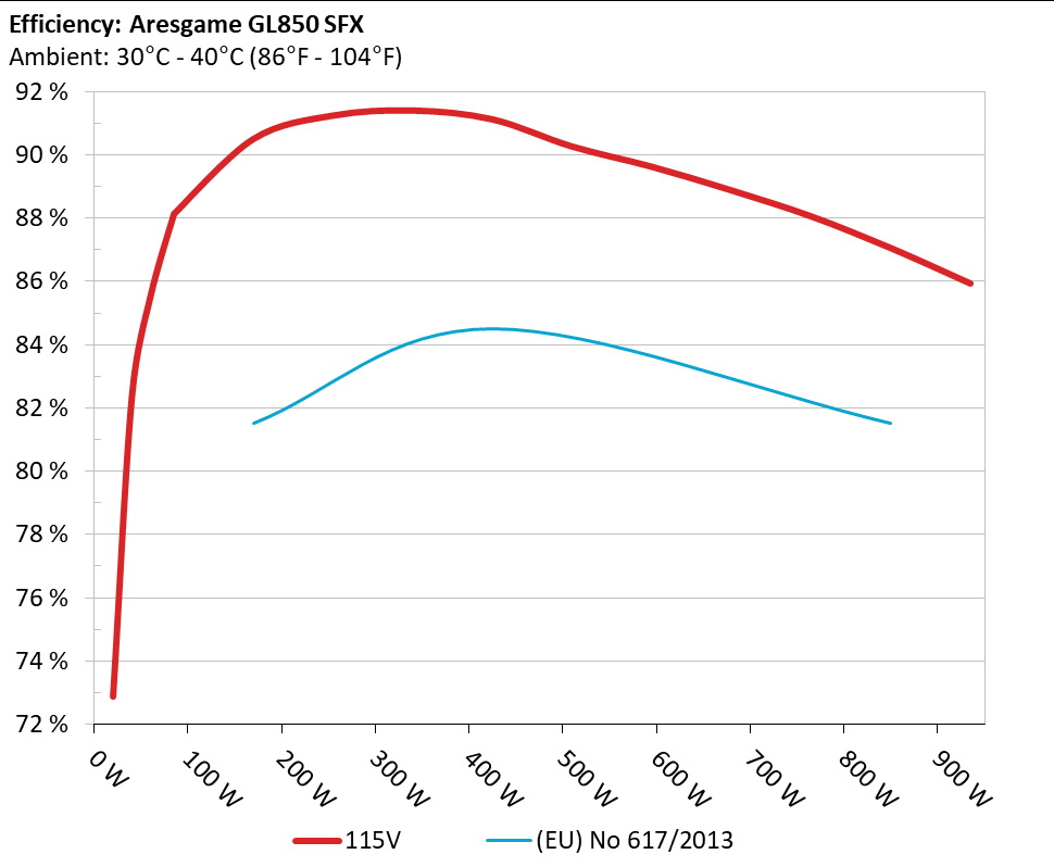 The PSU`s efficiency under high ambient temperatures with 115V and 230V input. For this graph the results of the 10-110% load regulation table are used