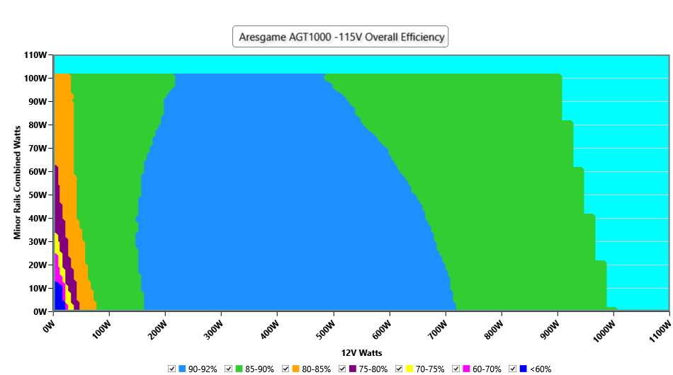 This graph depicts the PSU`s efficiency throughout its entire operational range. For the generation of the efficiency and noise graphs we set our loaders to auto mode through our custom-made software before trying thousands of possible load combinations