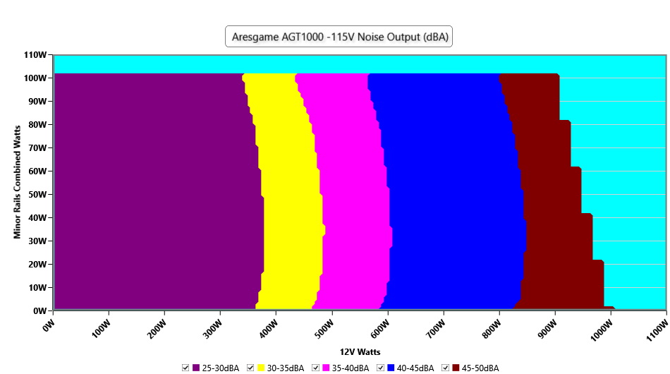 The PSU`s noise in its entire operational range and under 30-32 °C ambient is depicted in this graph. The X axis represents the load on the +12V rail(s) while the Y axis is the load on the minor rails