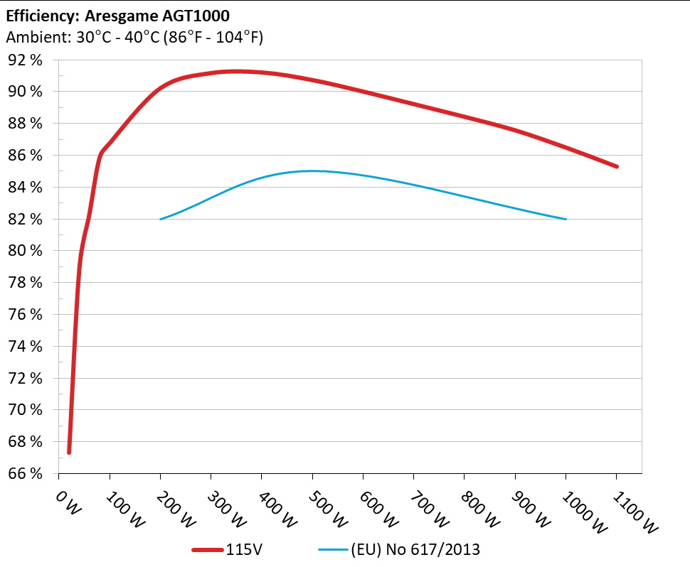 The PSU`s efficiency under high ambient temperatures with 115V and 230V input. For this graph the results of the 10-110% load regulation table are used