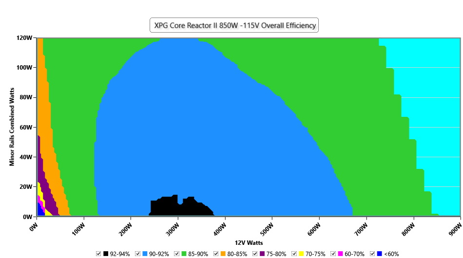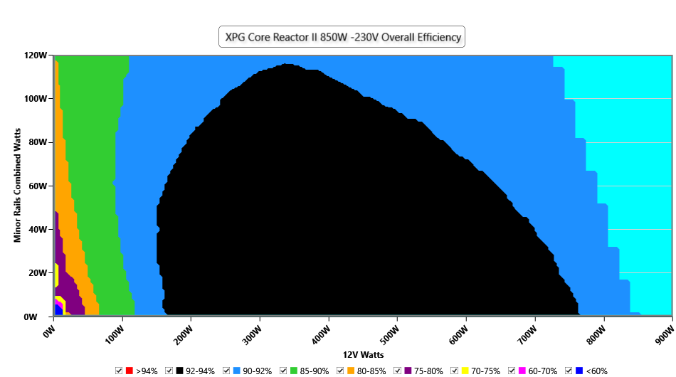 This graph depicts the PSU`s efficiency throughout its entire operational range. For the generation of the efficiency and noise graphs we set our loaders to auto mode through our custom-made software before trying thousands of possible load combinations