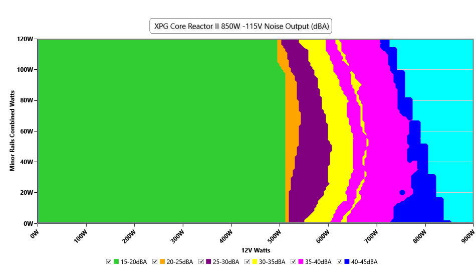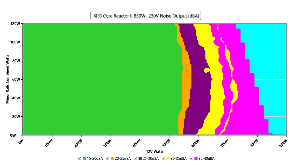 The PSU`s noise in its entire operational range and under 30-32 °C ambient is depicted in this graph. The X axis represents the load on the +12V rail(s) while the Y axis is the load on the minor rails