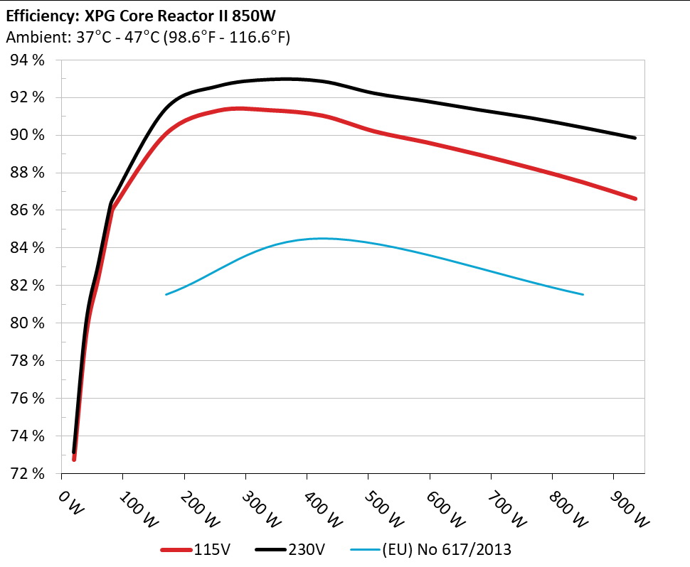The PSU`s efficiency under high ambient temperatures with 115V and 230V input. For this graph the results of the 10-110% load regulation table are used
