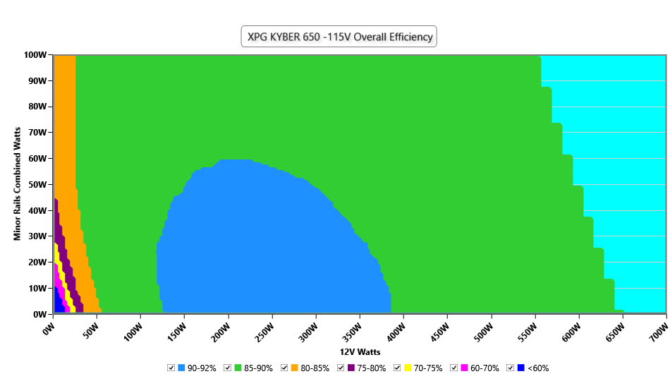 This graph depicts the PSU`s efficiency throughout its entire operational range. For the generation of the efficiency and noise graphs we set our loaders to auto mode through our custom-made software before trying thousands of possible load combinations