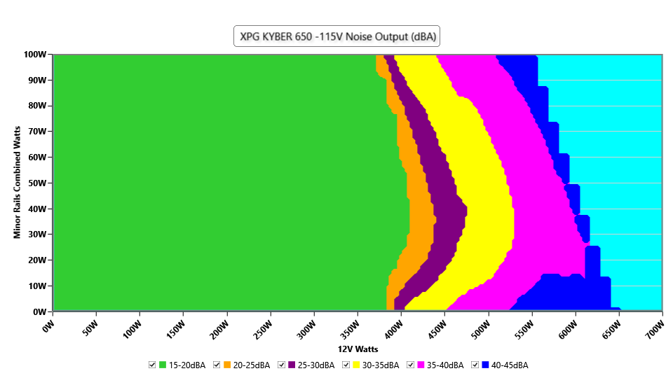 The PSU`s noise in its entire operational range and under 30-32 °C ambient is depicted in this graph. The X axis represents the load on the +12V rail(s) while the Y axis is the load on the minor rails