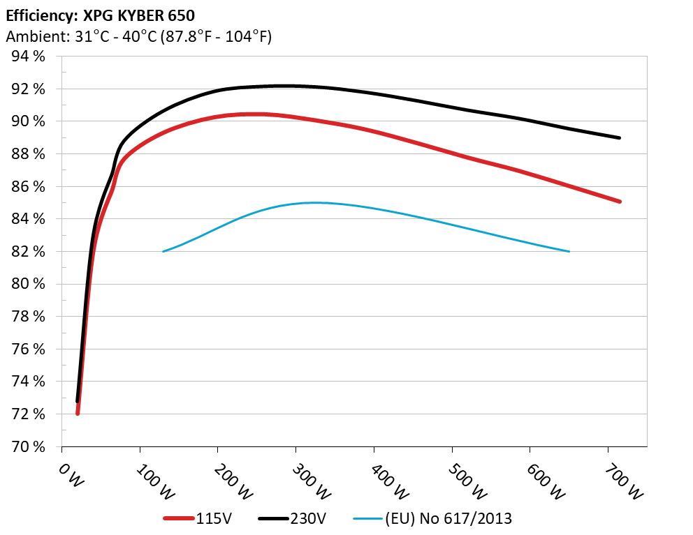 The PSU`s efficiency under high ambient temperatures with 115V and 230V input. For this graph the results of the 10-110% load regulation table are used
