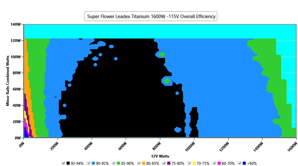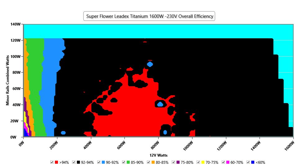 This graph depicts the PSU`s efficiency throughout its entire operational range. For the generation of the efficiency and noise graphs we set our loaders to auto mode through our custom-made software before trying thousands of possible load combinations