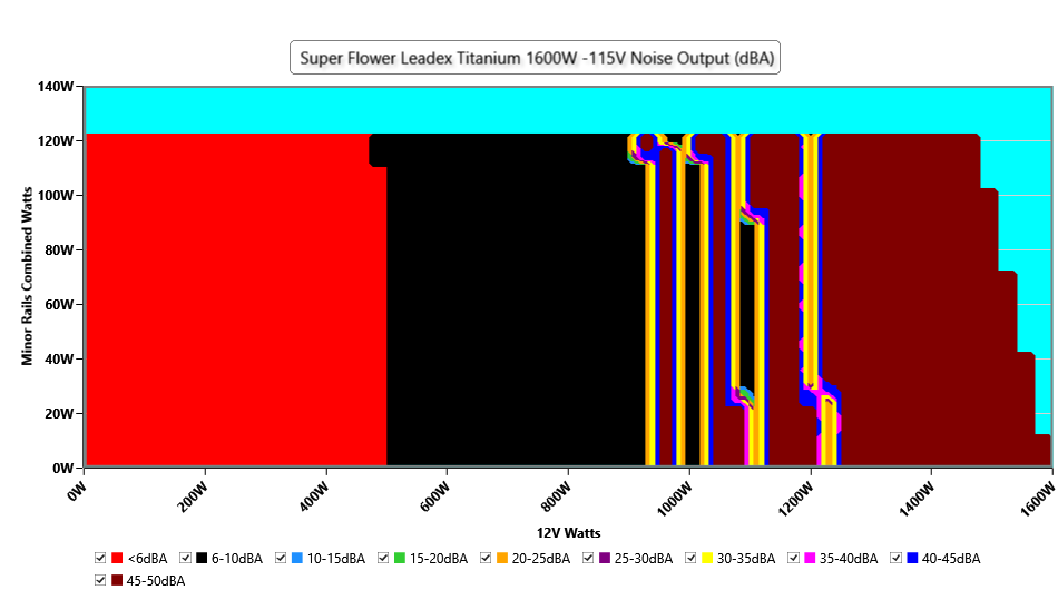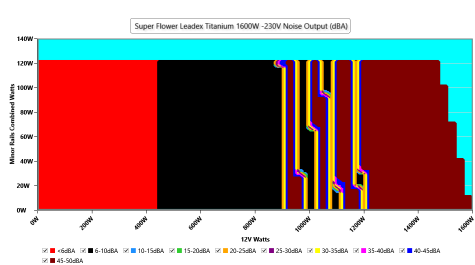 The PSU`s noise in its entire operational range and under 30-32 °C ambient is depicted in this graph. The X axis represents the load on the +12V rail(s) while the Y axis is the load on the minor rails