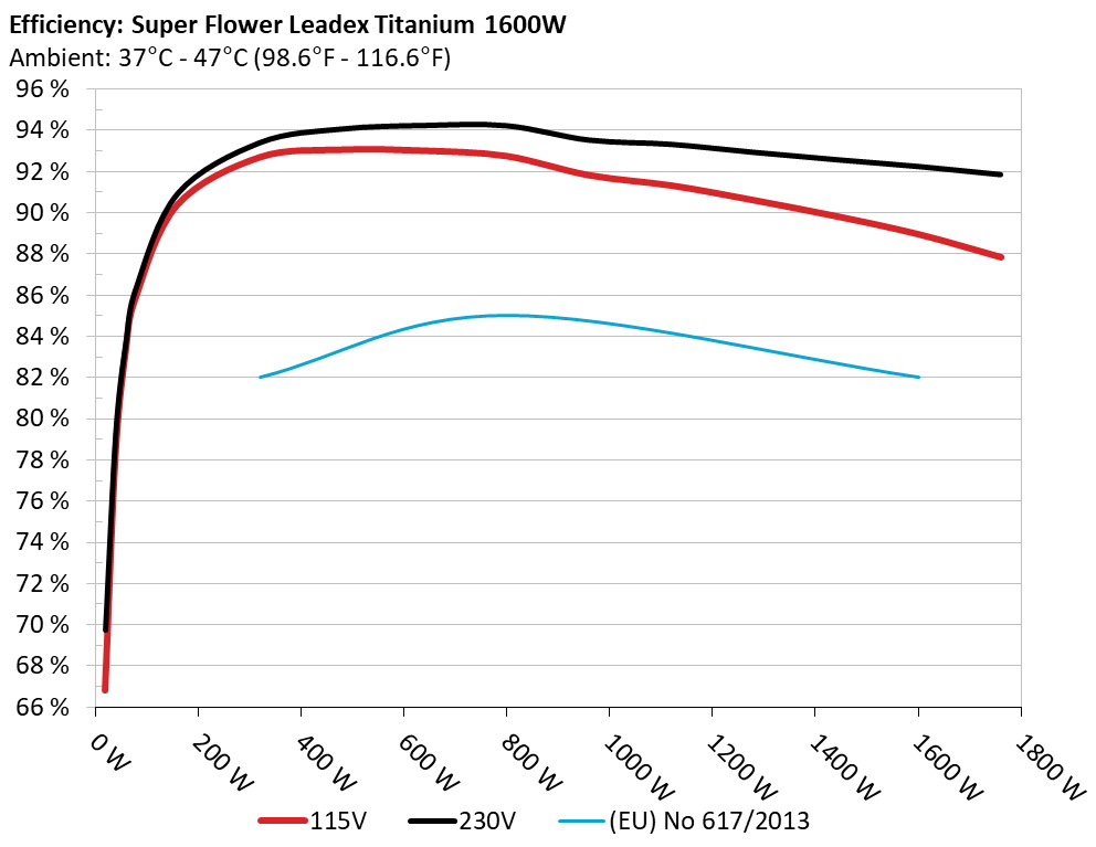 The PSU`s efficiency under high ambient temperatures with 115V and 230V input. For this graph the results of the 10-110% load regulation table are used