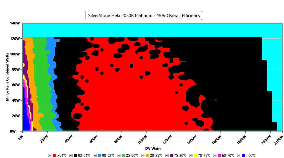 This graph depicts the PSU`s efficiency throughout its entire operational range. For the generation of the efficiency and noise graphs we set our loaders to auto mode through our custom-made software before trying thousands of possible load combinations