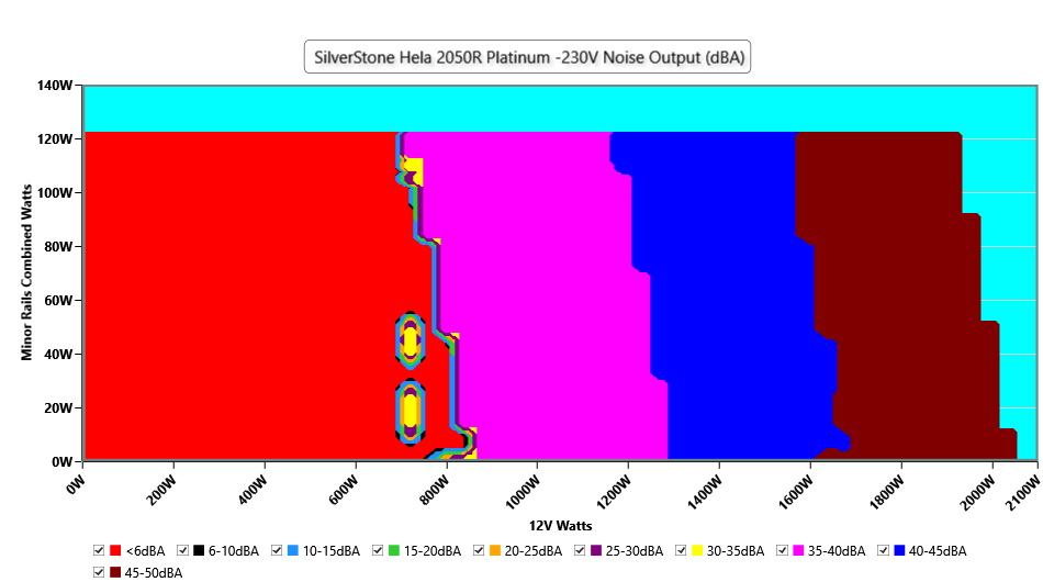 The PSU`s noise in its entire operational range and under 30-32 °C ambient is depicted in this graph. The X axis represents the load on the +12V rail(s) while the Y axis is the load on the minor rails