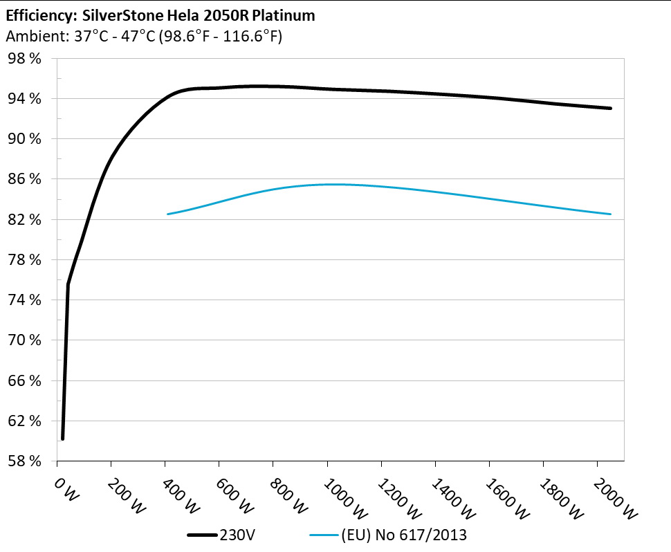 The PSU`s efficiency under high ambient temperatures with 115V and 230V input. For this graph the results of the 10-110% load regulation table are used