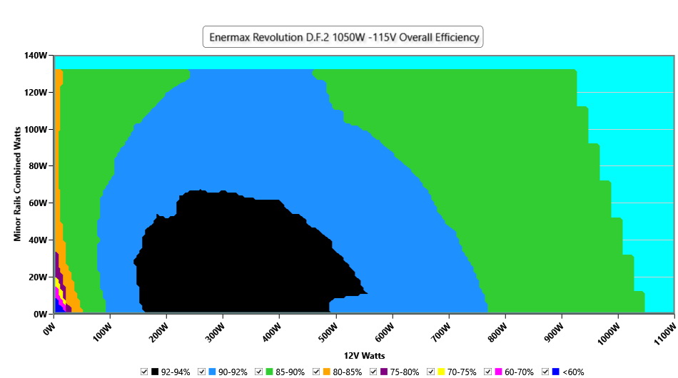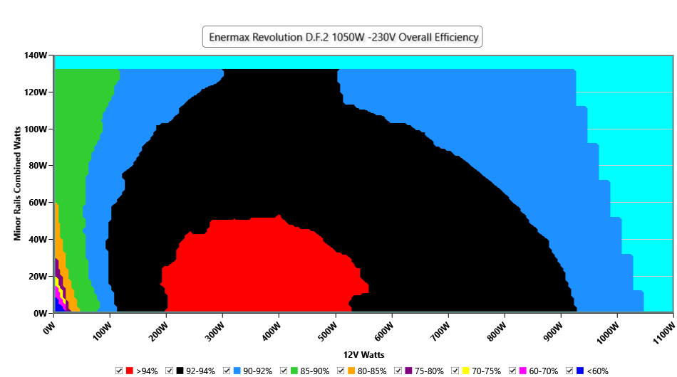 This graph depicts the PSU`s efficiency throughout its entire operational range. For the generation of the efficiency and noise graphs we set our loaders to auto mode through our custom-made software before trying thousands of possible load combinations
