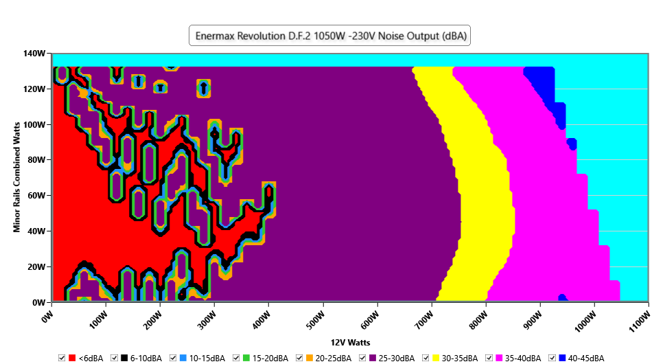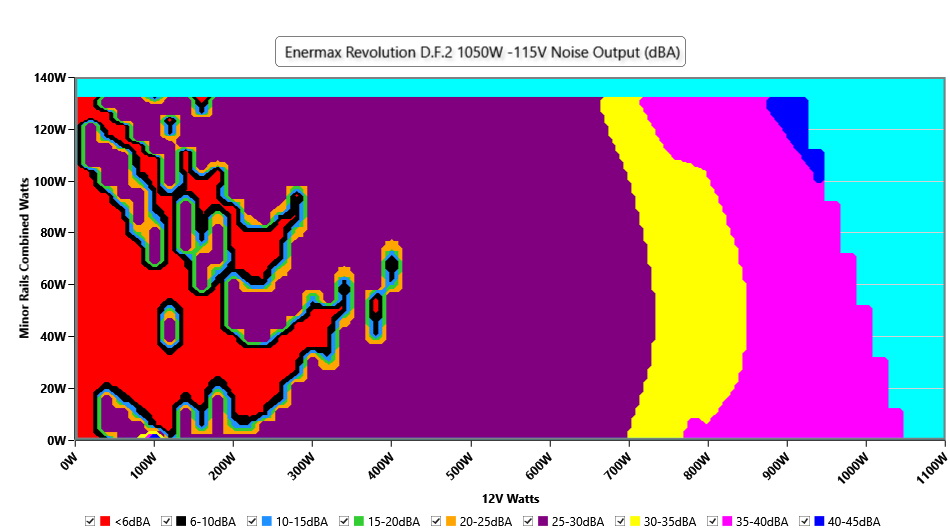 The PSU`s noise in its entire operational range and under 30-32 °C ambient is depicted in this graph. The X axis represents the load on the +12V rail(s) while the Y axis is the load on the minor rails