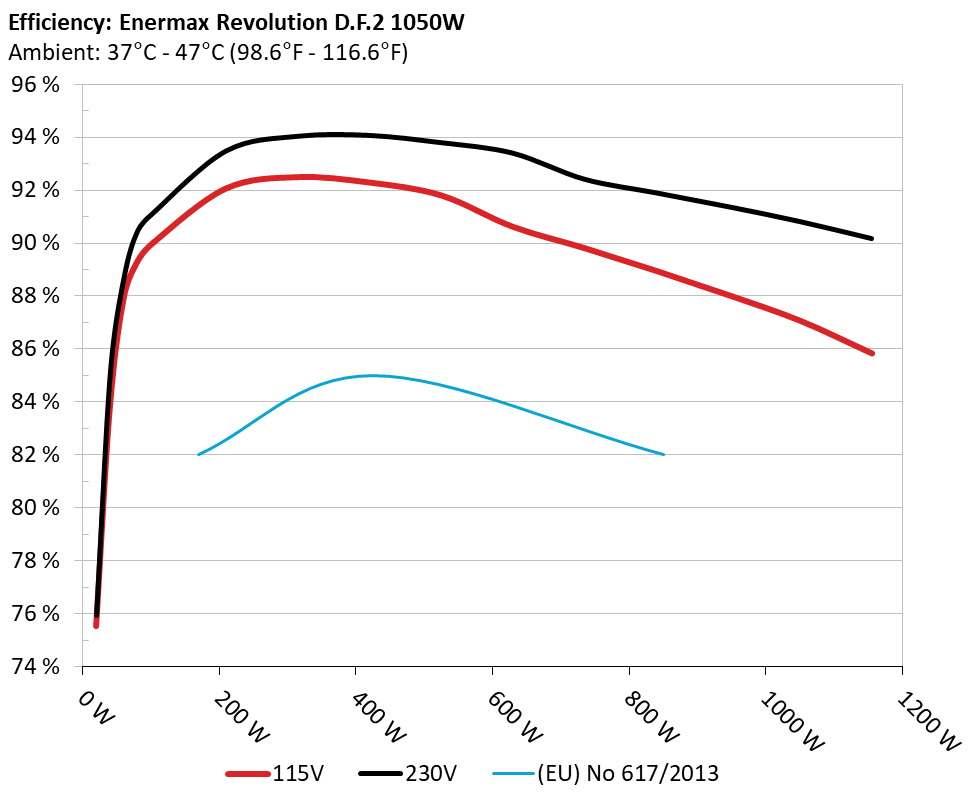 The PSU`s efficiency under high ambient temperatures with 115V and 230V input. For this graph the results of the 10-110% load regulation table are used