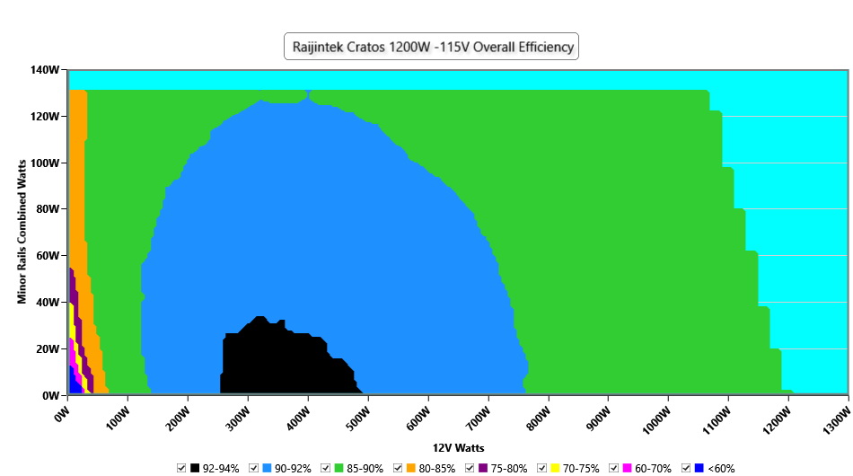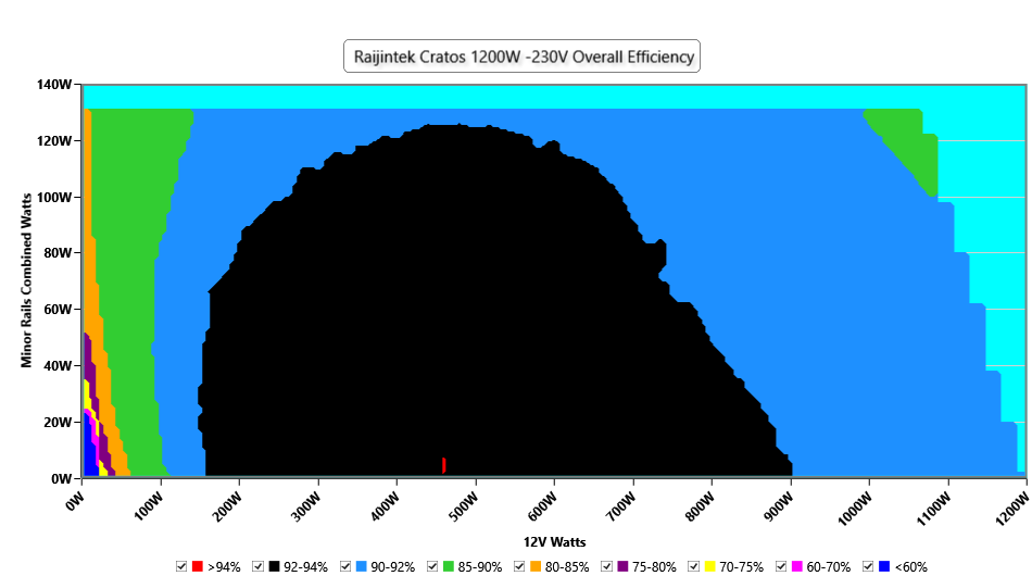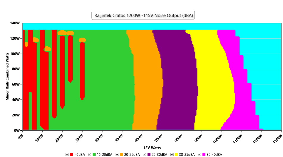 This graph depicts the PSU`s efficiency throughout its entire operational range. For the generation of the efficiency and noise graphs we set our loaders to auto mode through our custom-made software before trying thousands of possible load combinations