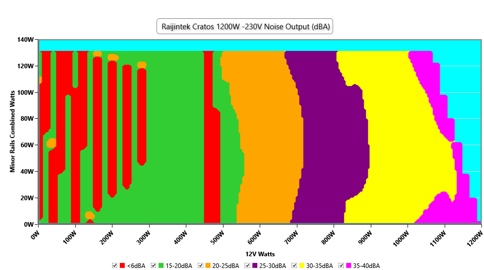 The PSU`s noise in its entire operational range and under 30-32 °C ambient is depicted in this graph. The X axis represents the load on the +12V rail(s) while the Y axis is the load on the minor rails