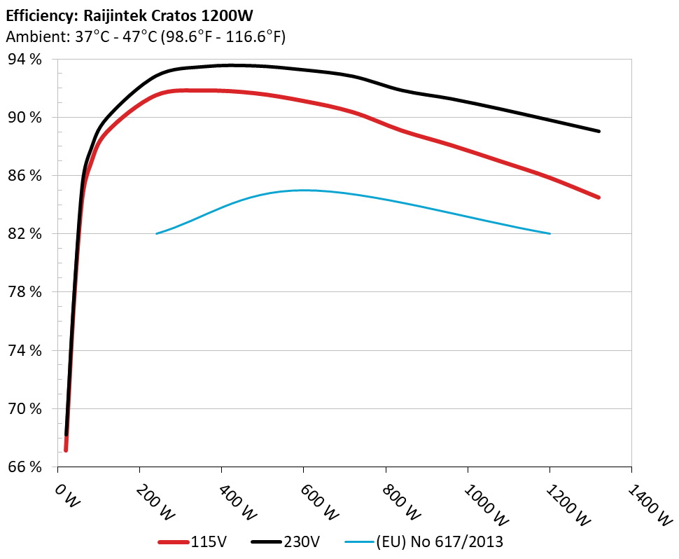The PSU`s efficiency under high ambient temperatures with 115V and 230V input. For this graph the results of the 10-110% load regulation table are used