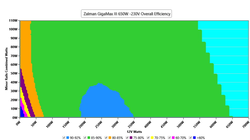 This graph depicts the PSU`s efficiency throughout its entire operational range. For the generation of the efficiency and noise graphs we set our loaders to auto mode through our custom-made software before trying thousands of possible load combinations