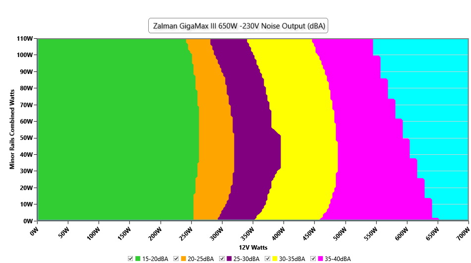 The PSU`s noise in its entire operational range and under 30-32 °C ambient is depicted in this graph. The X axis represents the load on the +12V rail(s) while the Y axis is the load on the minor rails