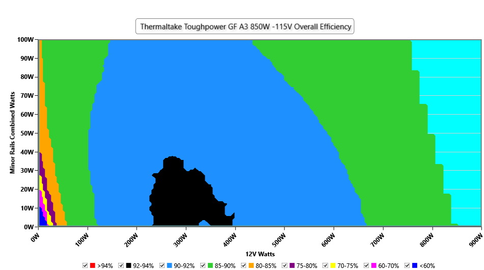 This graph depicts the PSU`s efficiency throughout its entire operational range. For the generation of the efficiency and noise graphs we set our loaders to auto mode through our custom-made software before trying thousands of possible load combinations