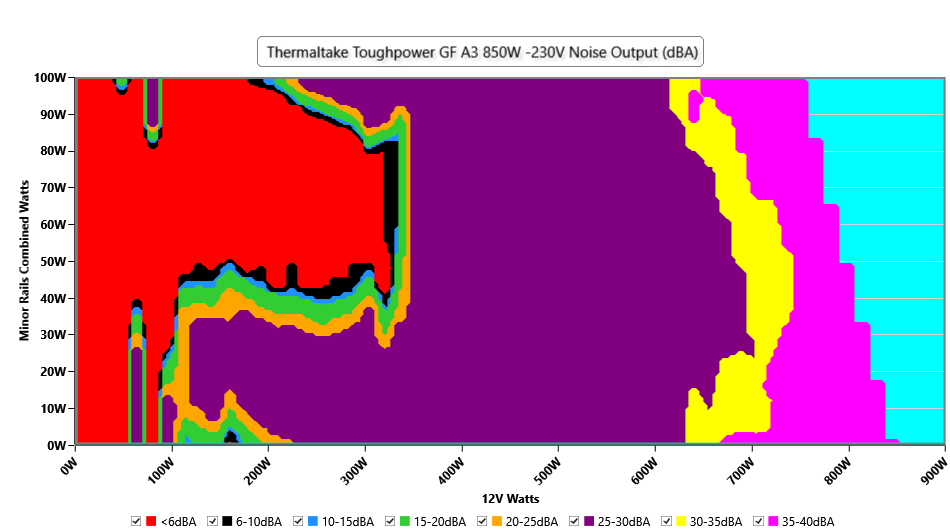 The PSU`s noise in its entire operational range and under 30-32 °C ambient is depicted in this graph. The X axis represents the load on the +12V rail(s) while the Y axis is the load on the minor rails