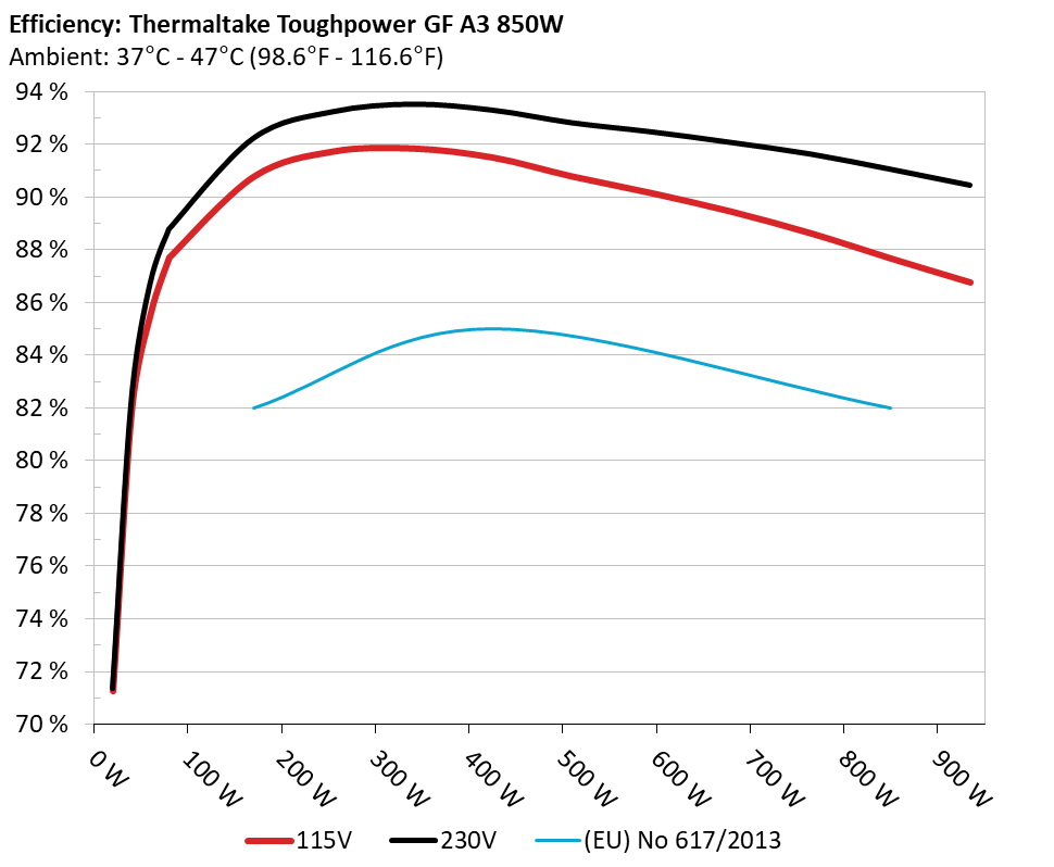 The PSU`s efficiency under high ambient temperatures with 115V and 230V input. For this graph the results of the 10-110% load regulation table are used
