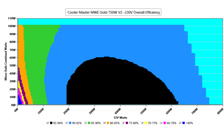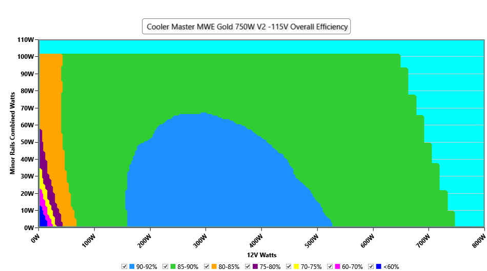 This graph depicts the PSU`s efficiency throughout its entire operational range. For the generation of the efficiency and noise graphs we set our loaders to auto mode through our custom-made software before trying thousands of possible load combinations