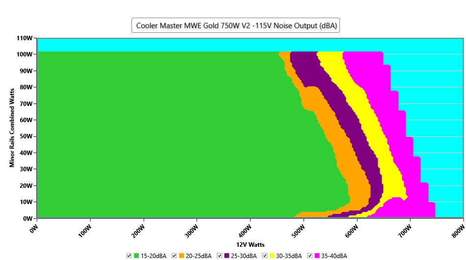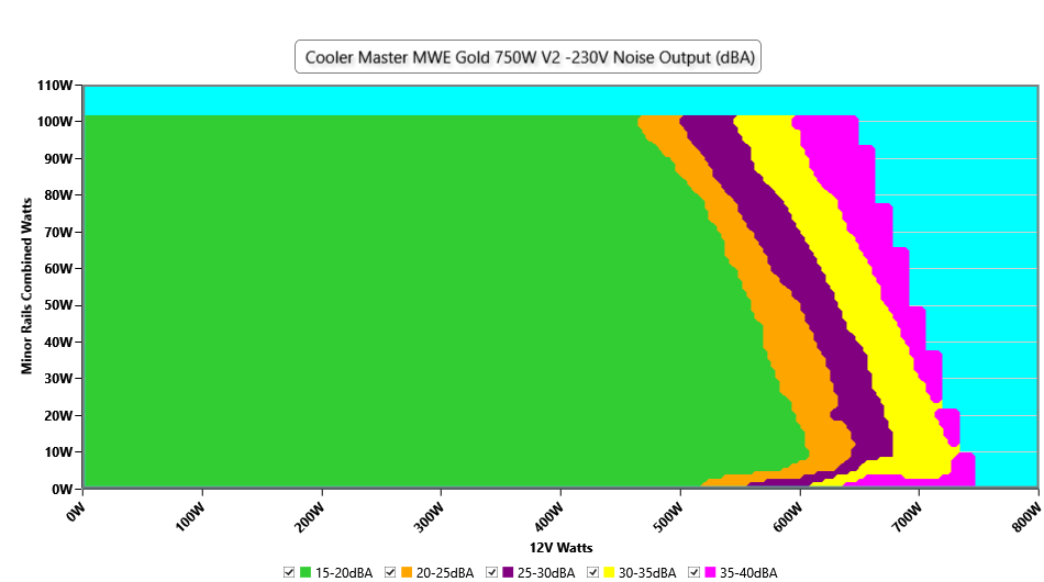 The PSU`s noise in its entire operational range and under 30-32 °C ambient is depicted in this graph. The X axis represents the load on the +12V rail(s) while the Y axis is the load on the minor rails