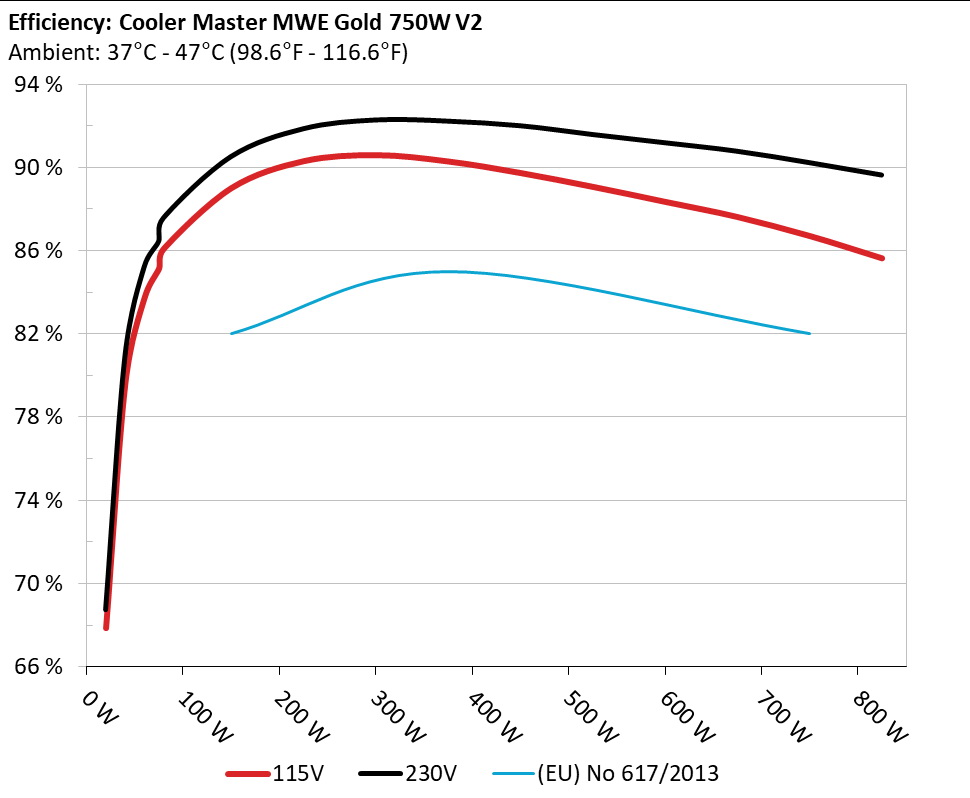 The PSU`s efficiency under high ambient temperatures with 115V and 230V input. For this graph the results of the 10-110% load regulation table are used