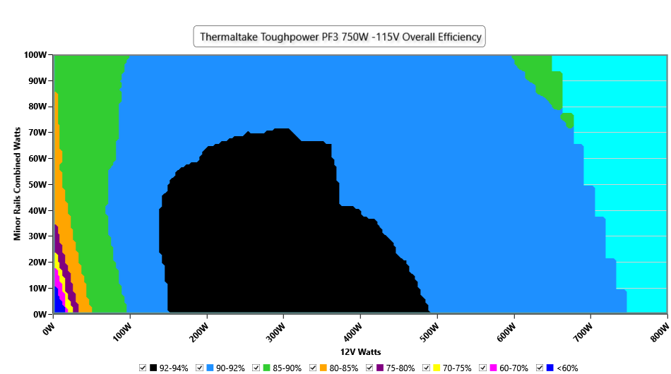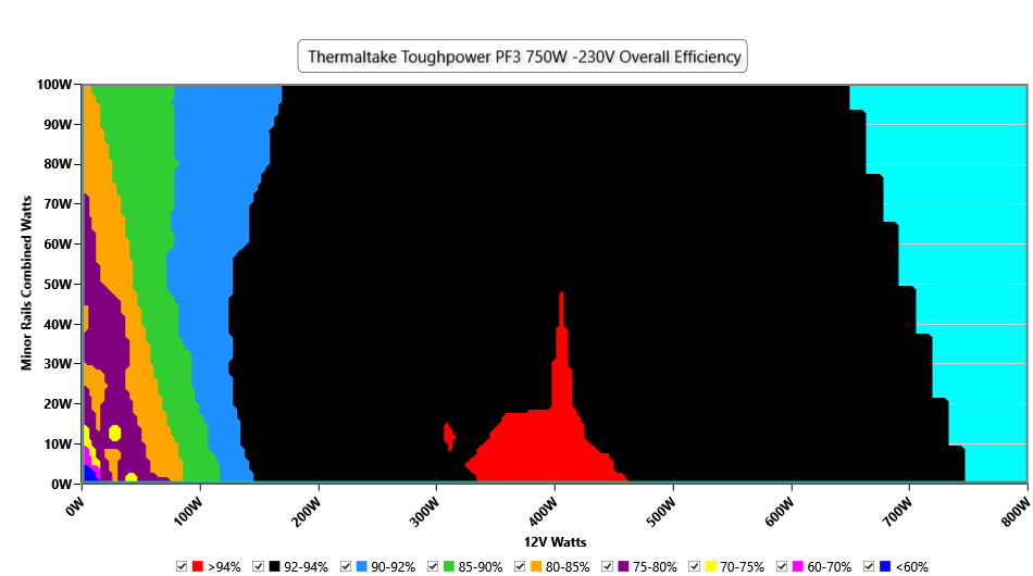 This graph depicts the PSU`s efficiency throughout its entire operational range. For the generation of the efficiency and noise graphs we set our loaders to auto mode through our custom-made software before trying thousands of possible load combinations