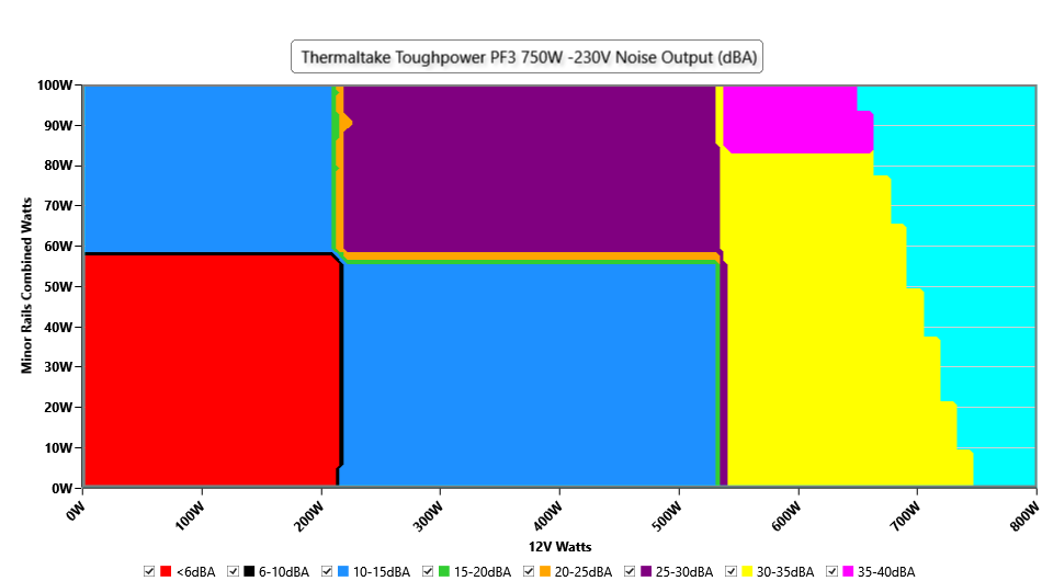 The PSU`s noise in its entire operational range and under 30-32 °C ambient is depicted in this graph. The X axis represents the load on the +12V rail(s) while the Y axis is the load on the minor rails