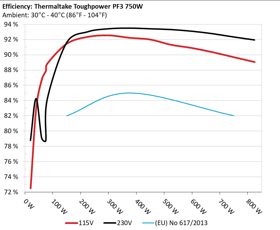 The PSU`s efficiency under high ambient temperatures with 115V and 230V input. For this graph the results of the 10-110% load regulation table are used