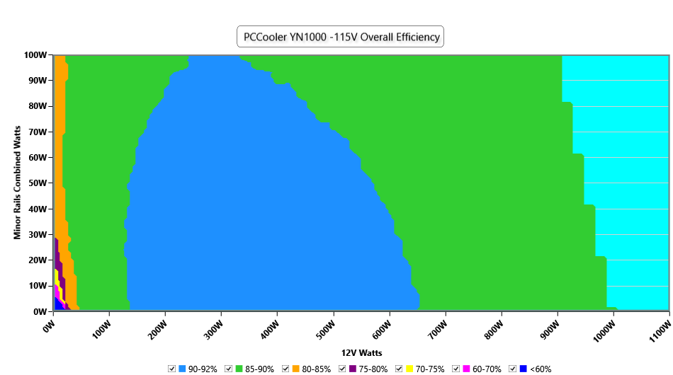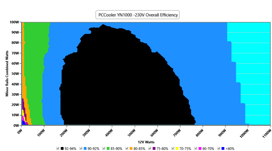 This graph depicts the PSU`s efficiency throughout its entire operational range. For the generation of the efficiency and noise graphs we set our loaders to auto mode through our custom-made software before trying thousands of possible load combinations