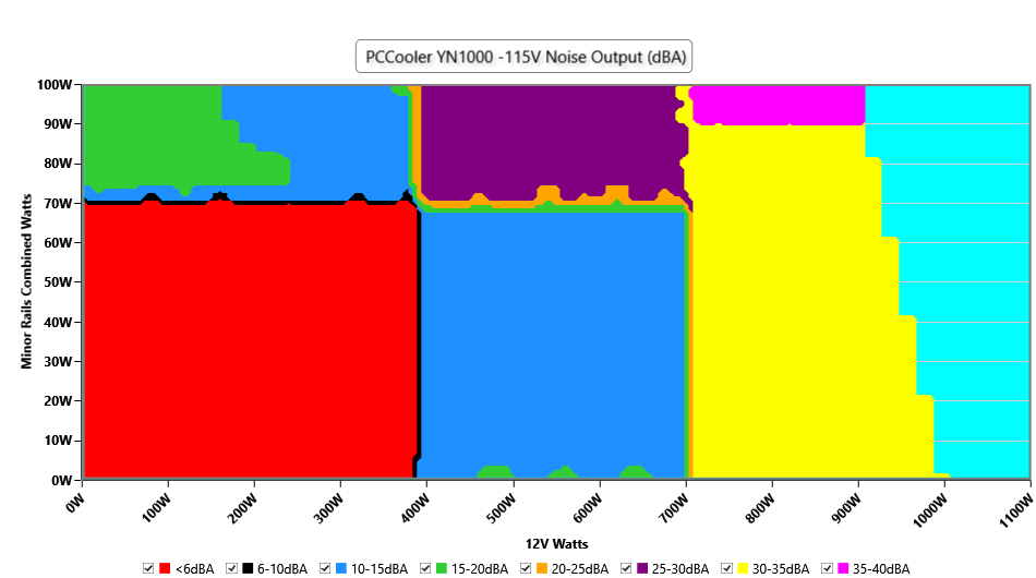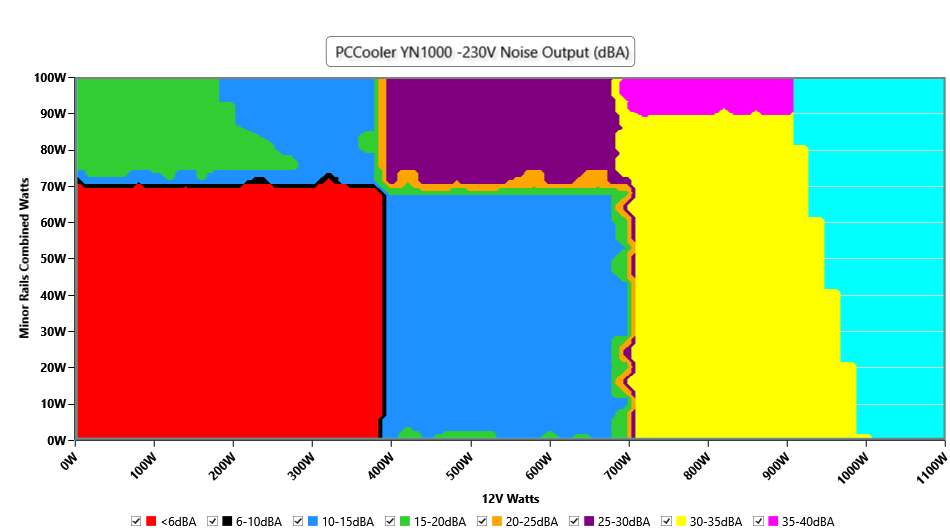 The PSU`s noise in its entire operational range and under 30-32 °C ambient is depicted in this graph. The X axis represents the load on the +12V rail(s) while the Y axis is the load on the minor rails