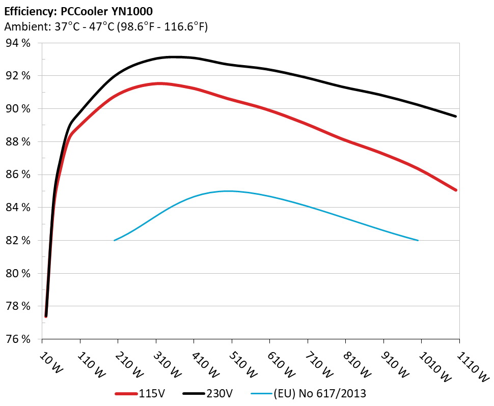 The PSU`s efficiency under high ambient temperatures with 115V and 230V input. For this graph the results of the 10-110% load regulation table are used