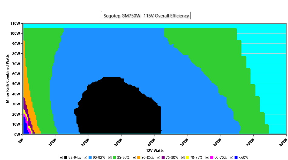 This graph depicts the PSU`s efficiency throughout its entire operational range. For the generation of the efficiency and noise graphs we set our loaders to auto mode through our custom-made software before trying thousands of possible load combinations