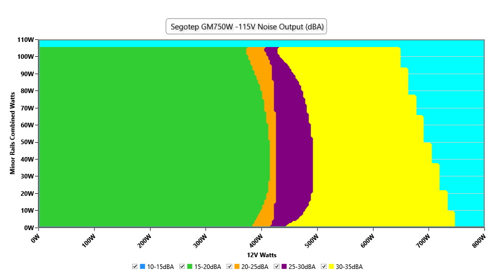 The PSU`s noise in its entire operational range and under 30-32 °C ambient is depicted in this graph. The X axis represents the load on the +12V rail(s) while the Y axis is the load on the minor rails