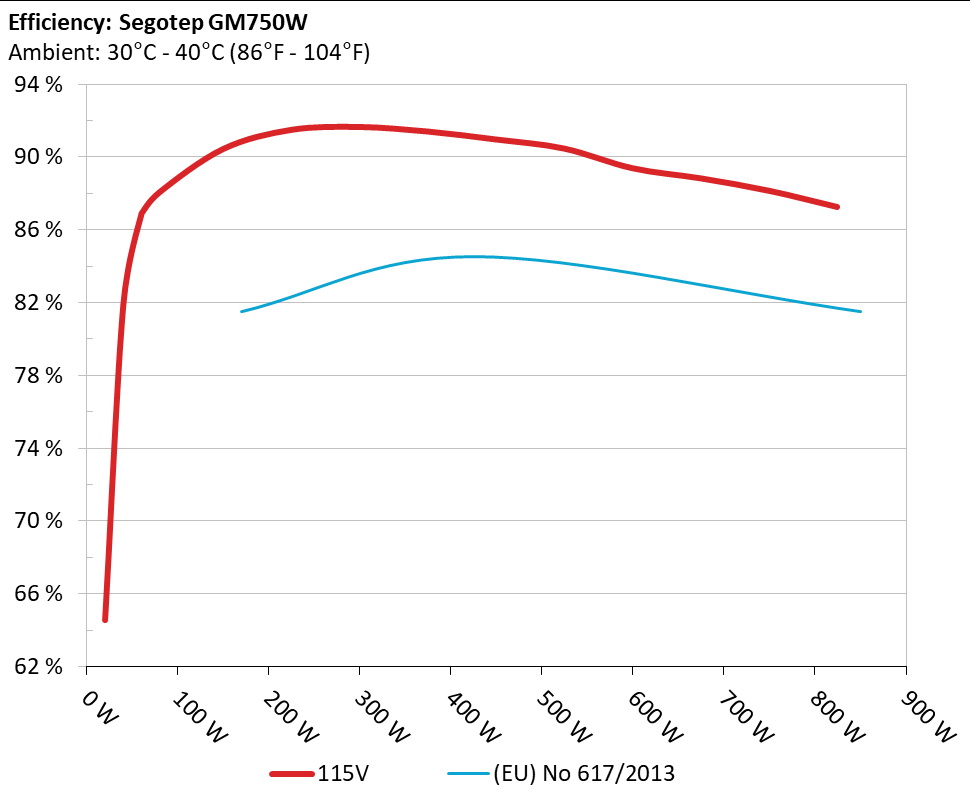 The PSU`s efficiency under high ambient temperatures with 115V and 230V input. For this graph the results of the 10-110% load regulation table are used