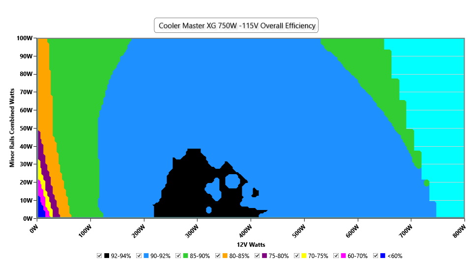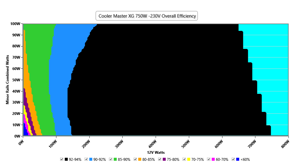 This graph depicts the PSU`s efficiency throughout its entire operational range. For the generation of the efficiency and noise graphs we set our loaders to auto mode through our custom-made software before trying thousands of possible load combinations