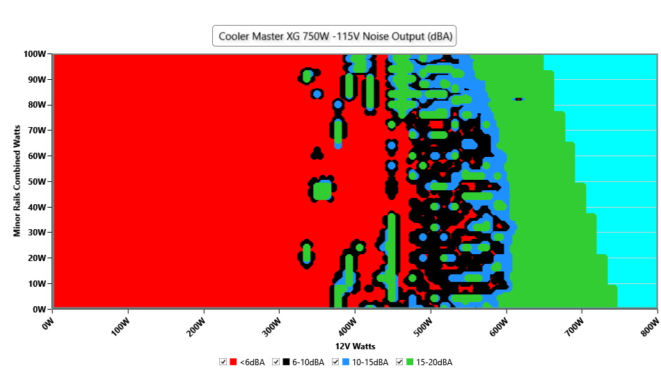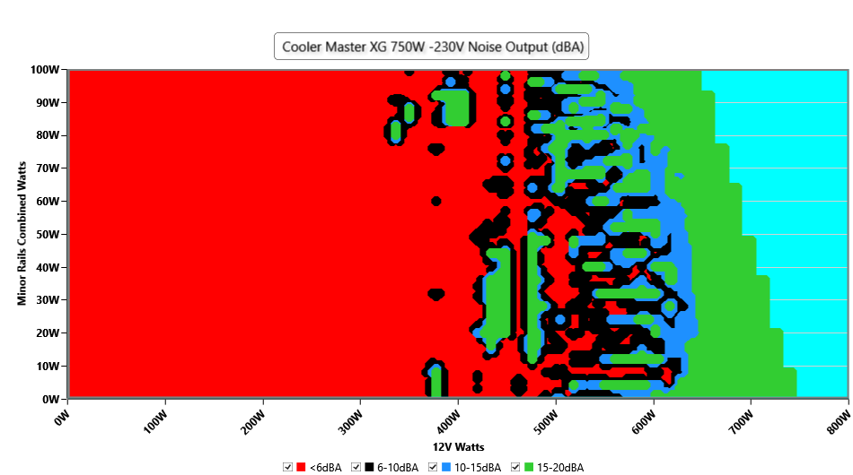 The PSU`s noise in its entire operational range and under 30-32 °C ambient is depicted in this graph. The X axis represents the load on the +12V rail(s) while the Y axis is the load on the minor rails