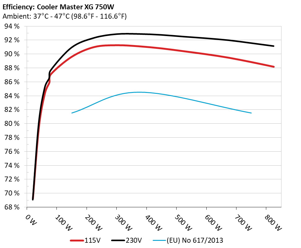 The PSU`s efficiency under high ambient temperatures with 115V and 230V input. For this graph the results of the 10-110% load regulation table are used