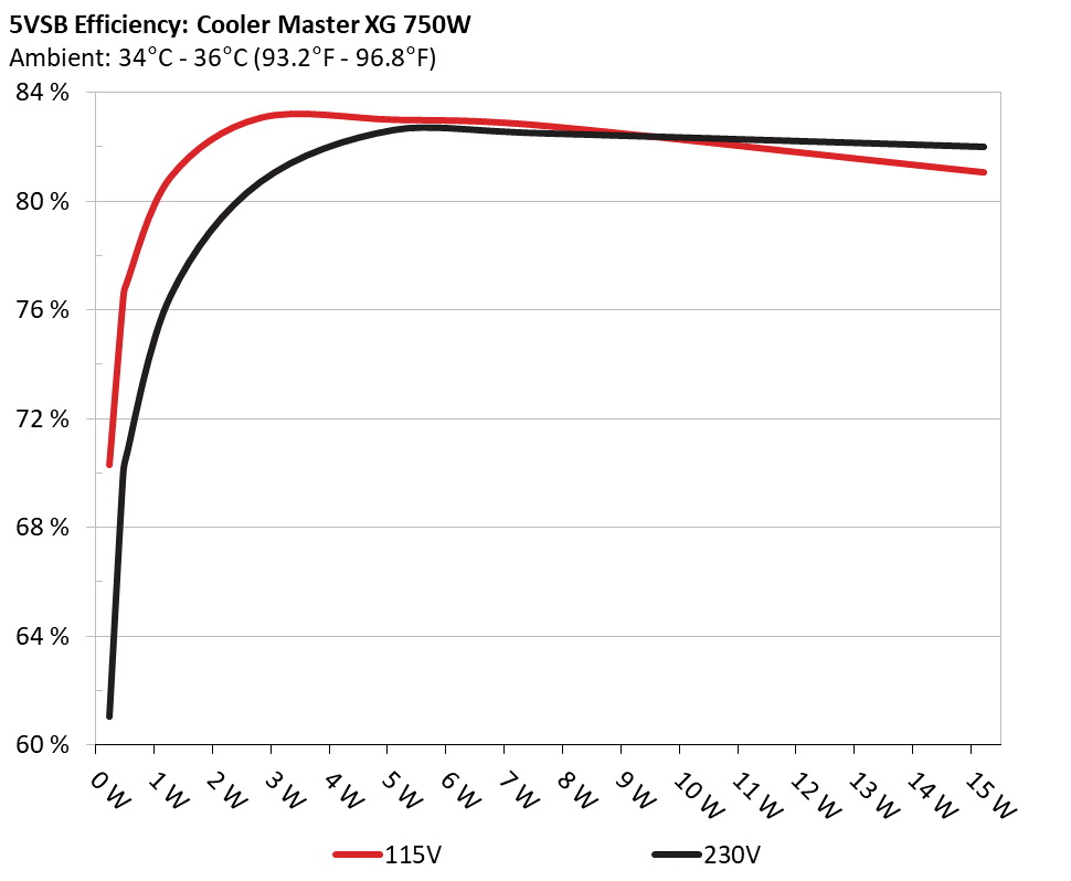This graph depicts the efficiency levels of the 5VSB rail with 115V and 230V input