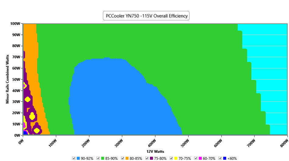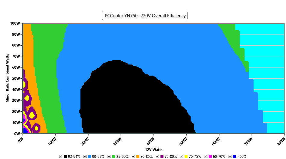 This graph depicts the PSU`s efficiency throughout its entire operational range. For the generation of the efficiency and noise graphs we set our loaders to auto mode through our custom-made software before trying thousands of possible load combinations