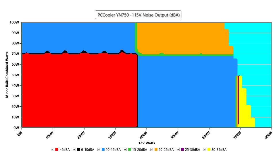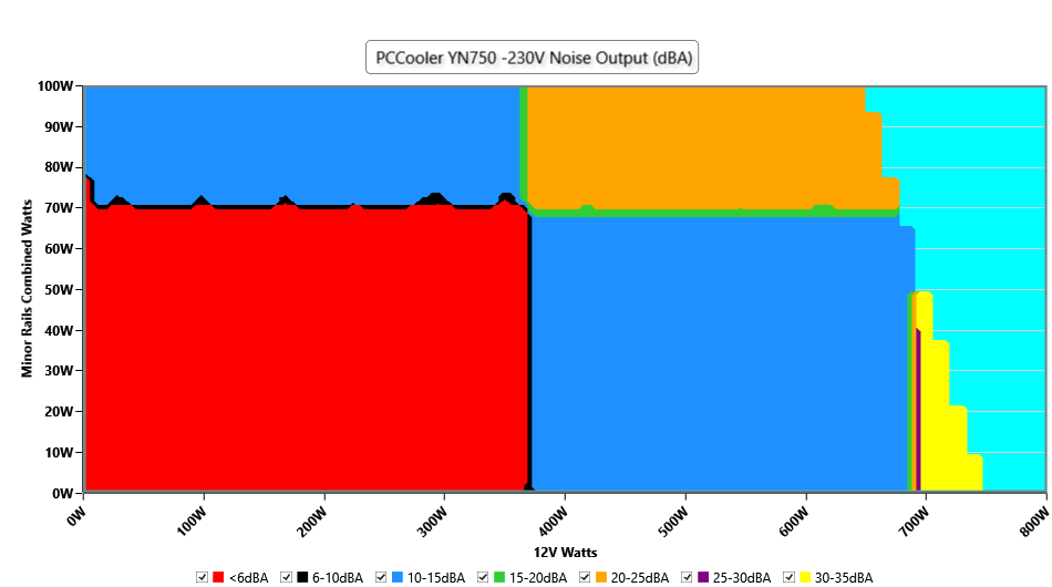 The PSU`s noise in its entire operational range and under 30-32 °C ambient is depicted in this graph. The X axis represents the load on the +12V rail(s) while the Y axis is the load on the minor rails